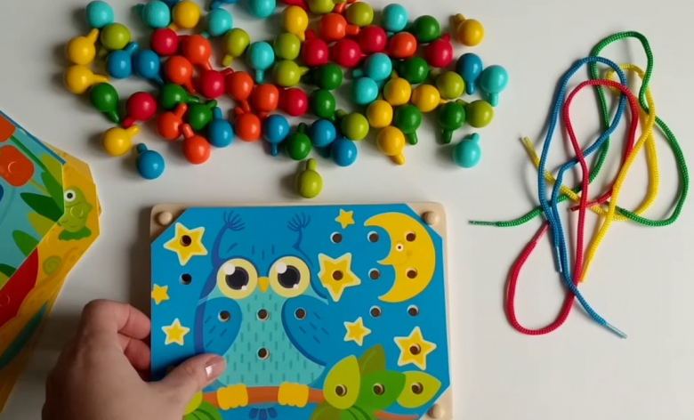 Мозаика-шнуровка. Универсальная игрушка с широкой душой и большим потенциалом. Это доска средних размеров из натурального дерева с отверстиями. Помимо карточек, в комплект идут шарики и шнурки. Задача — втыкать шарики и сплетать нити таким образом, чтобы получилась логичная картинка или узор. Доступны ситуации «продолжи ряд» / «собери по образцу». В игровой форме мальчик будет осваивать творчество, развивать фантазию. Отличная тренировка мелкой моторики! Играть лучше под присмотром взрослого, потому что шарики небольшие.