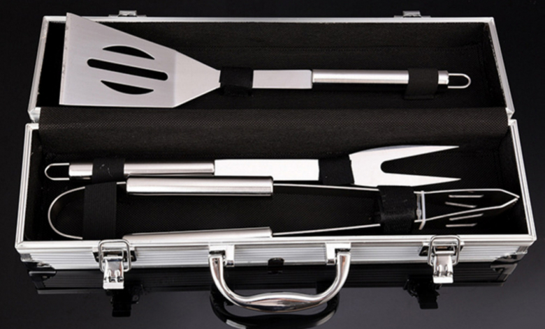 Набор для барбекю в кейсе - великолепный оригинальный подарок. Он настолько продуман, что способен вызвать только восхищение. Может быть дешевле или дороже, в зависимости от вашего бюджета. Обычно в него входит несколько специальных предметов для приготовления мяса на огне – это лопатка, щипцы, молоток для отбивания стейка, нож. Бывают наборы дополненные персональными вилками и ножами, а так же солонкой и перечницей.