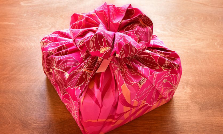 Ещё подарок замечательно упаковывается в платок, и это действительно неповторимо! При выборе способа упаковки подарка тканью будет уместна лента, или, используя ту же ткань, можно завершить композицию массивным узлом или бантом. Стоит заметить, что в отличие от бумаги, ткань как бы обволакивает предмет, при её использовании исключаются заломы, и подарок абсолютно любой формы можно завернуть в ткань. Полотно приятно на ощупь, что будет усиливать тактильные ощущения от подарка.